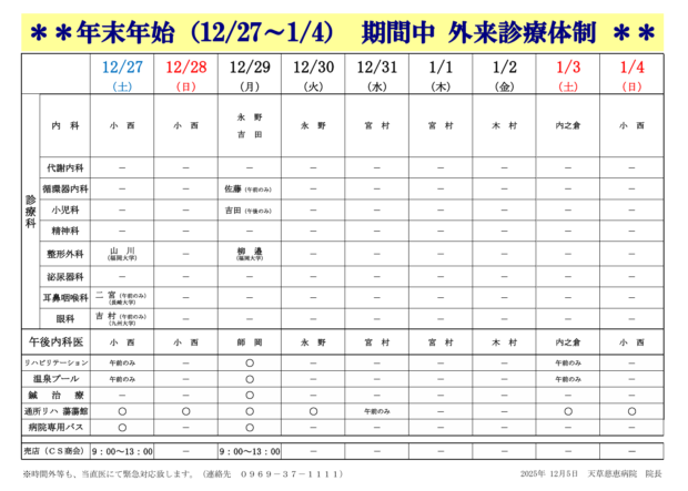 年末年始の診療体制は以下のとおりです。