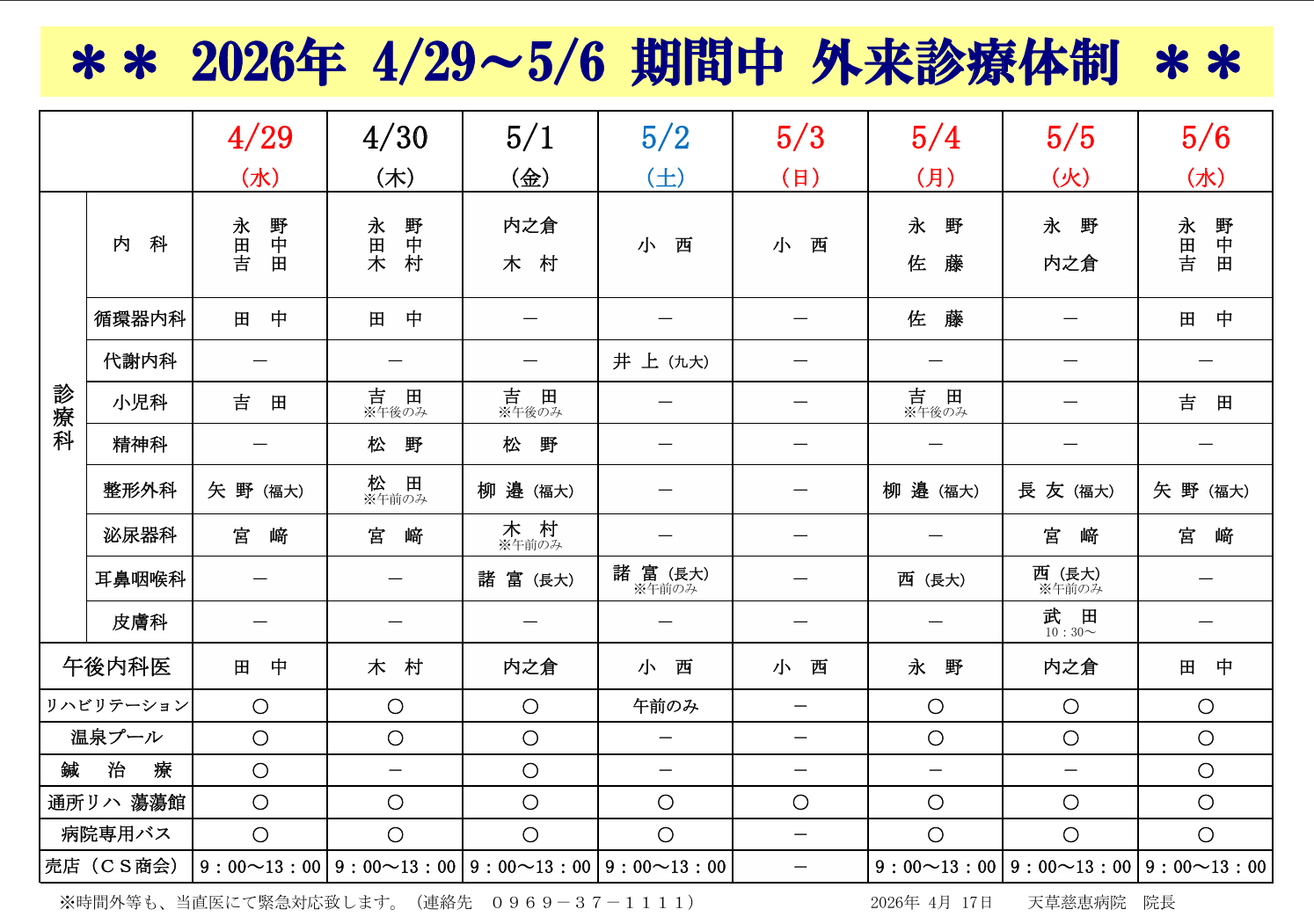 当院は、ゴールデンウイーク中も、平常診療致しております。お困りの際は病院受付(0969-37-1111)までご連絡下さい。詳しくは下記をご覧ください。
